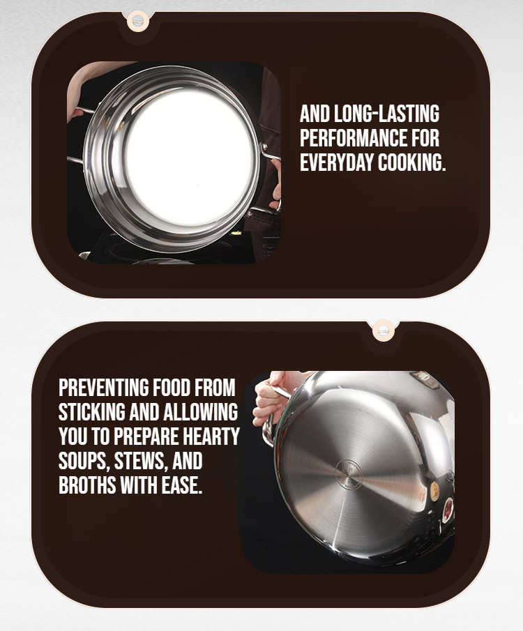 ● Crafted from premium 316 thickened stainless steel, this soup pot offers exceptional durability, rust resistance, and long-lasting performance for everyday cooking.
