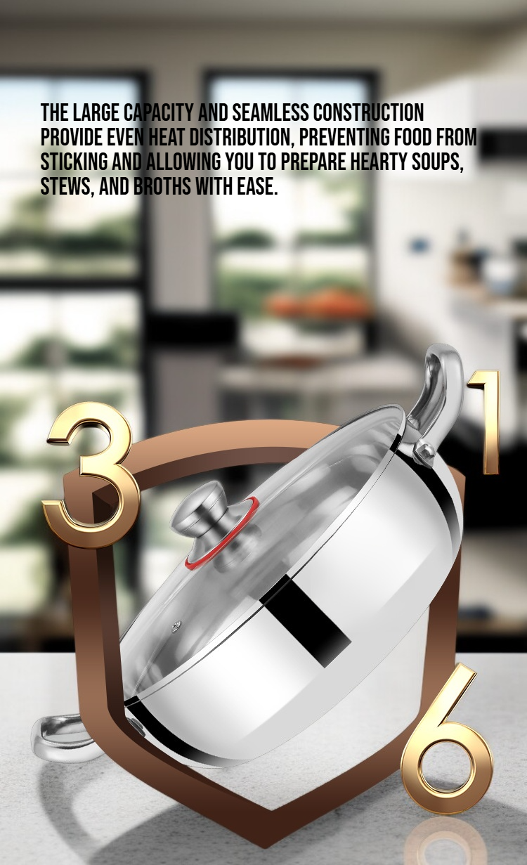 ● The large capacity and seamless construction provide even heat distribution, preventing food from sticking and allowing you to prepare hearty soups, stews, and broths with ease.